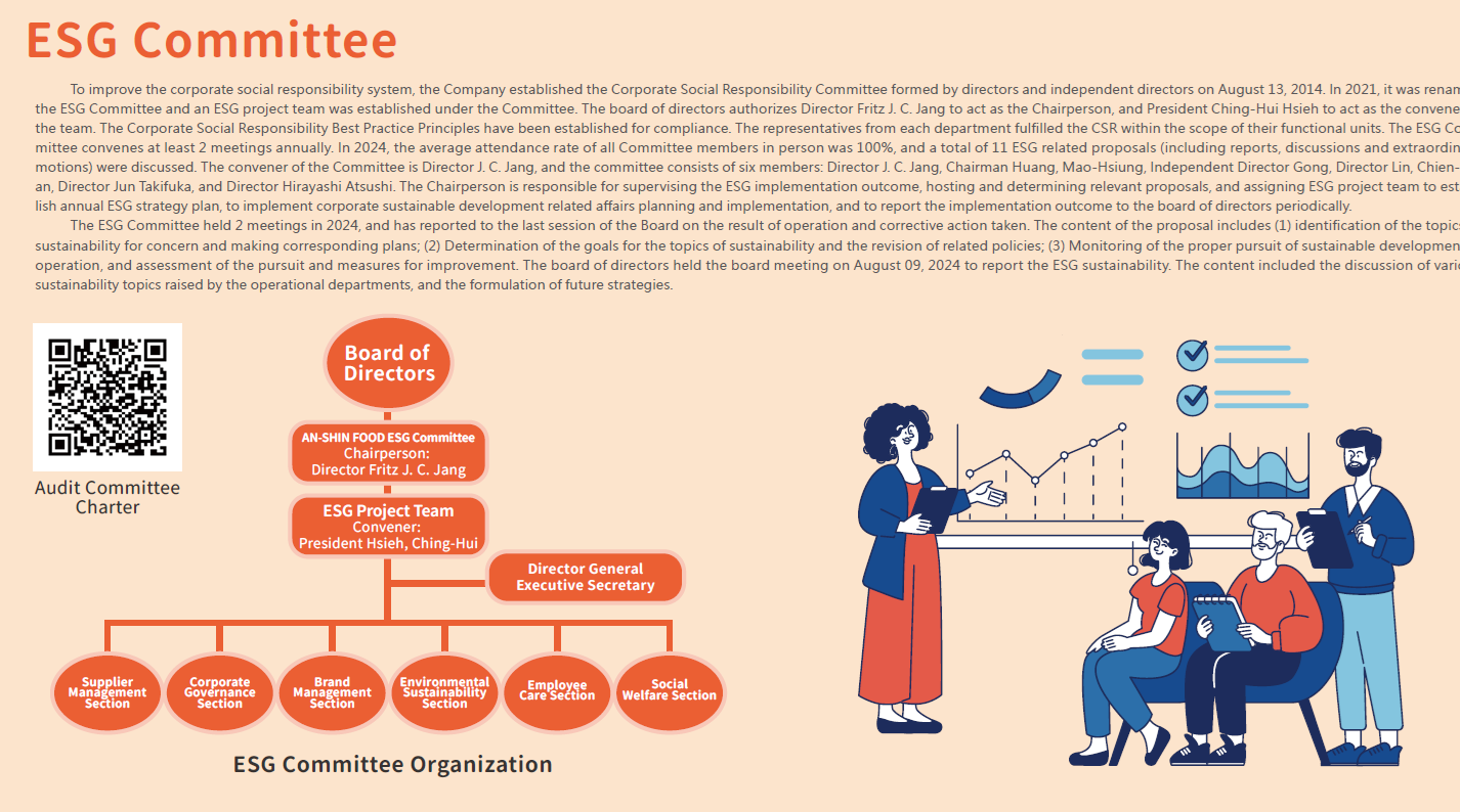 Our goal is to become the most reassuring catering company for customers, and it was also the core value of our sustainable development. We take "Safety and Healthy" as our sustainable strategy and integrate with the 3Q innovations, smart technology and unique experience. Started from 5 goals selected from the 11 SDGs that we focused on, An-Shin formed a sustainable development strategy framework by utilizing the corporate resources, response and identifies the stakeholders' interests and concerns.